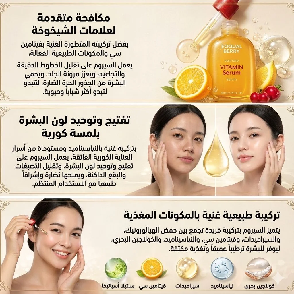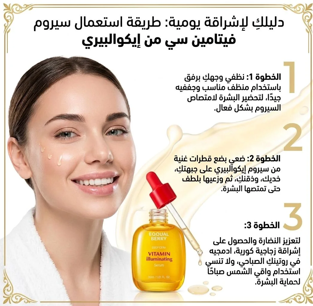"سيروم إيكوال بيري فيتامين سي المضيء" هو منتج قوي وفعال يعمل على توحيد لون البشرة وتقليل ظهور البقع الداكنة. تركيبته الفريدة تضمن لك إشراقة كورية نضرة ومشرقة طوال اليوم. ادمجيه في روتينك اليومي لتحصلي على بشرة ناعمة ومشعة، ولا تنسي استخدام واقي الشمس صباحًا لحماية بشرتك من العوامل الخارجية.